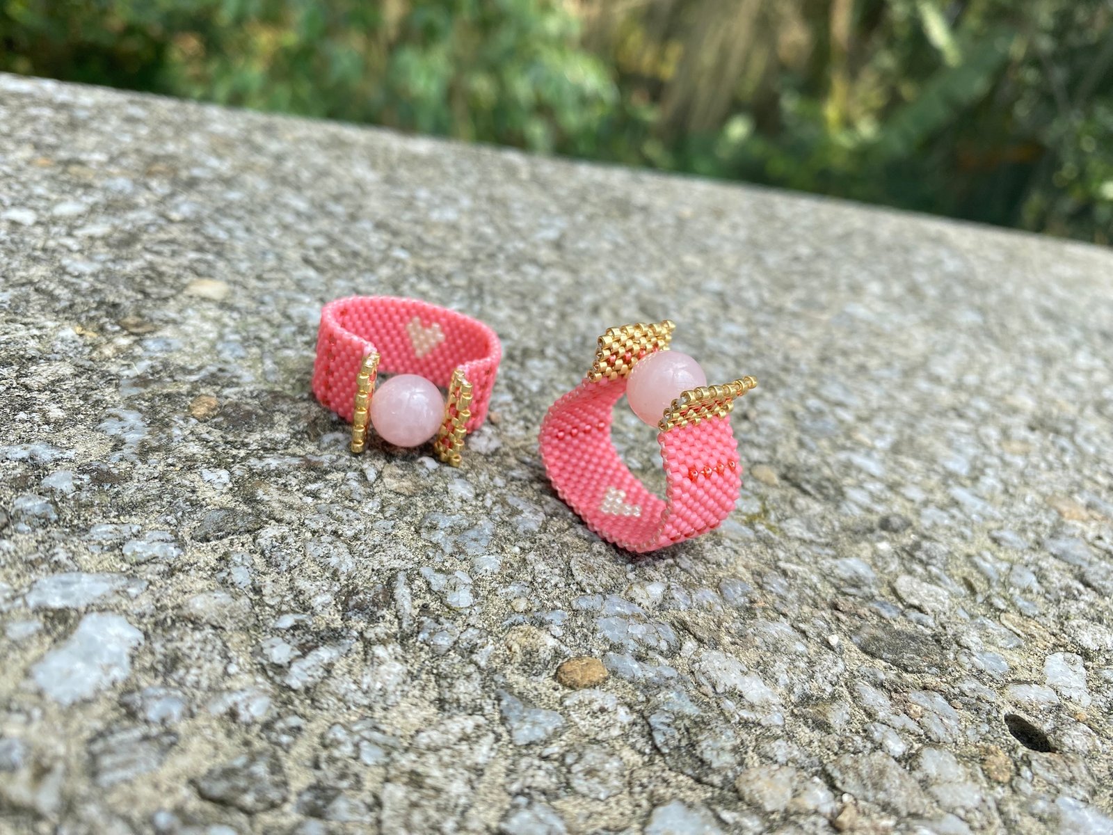+ EnvíoAnillo tejido a mano con delicas y coronado con un cuarzo rosa de alta calidad. viene en todas las tallas.