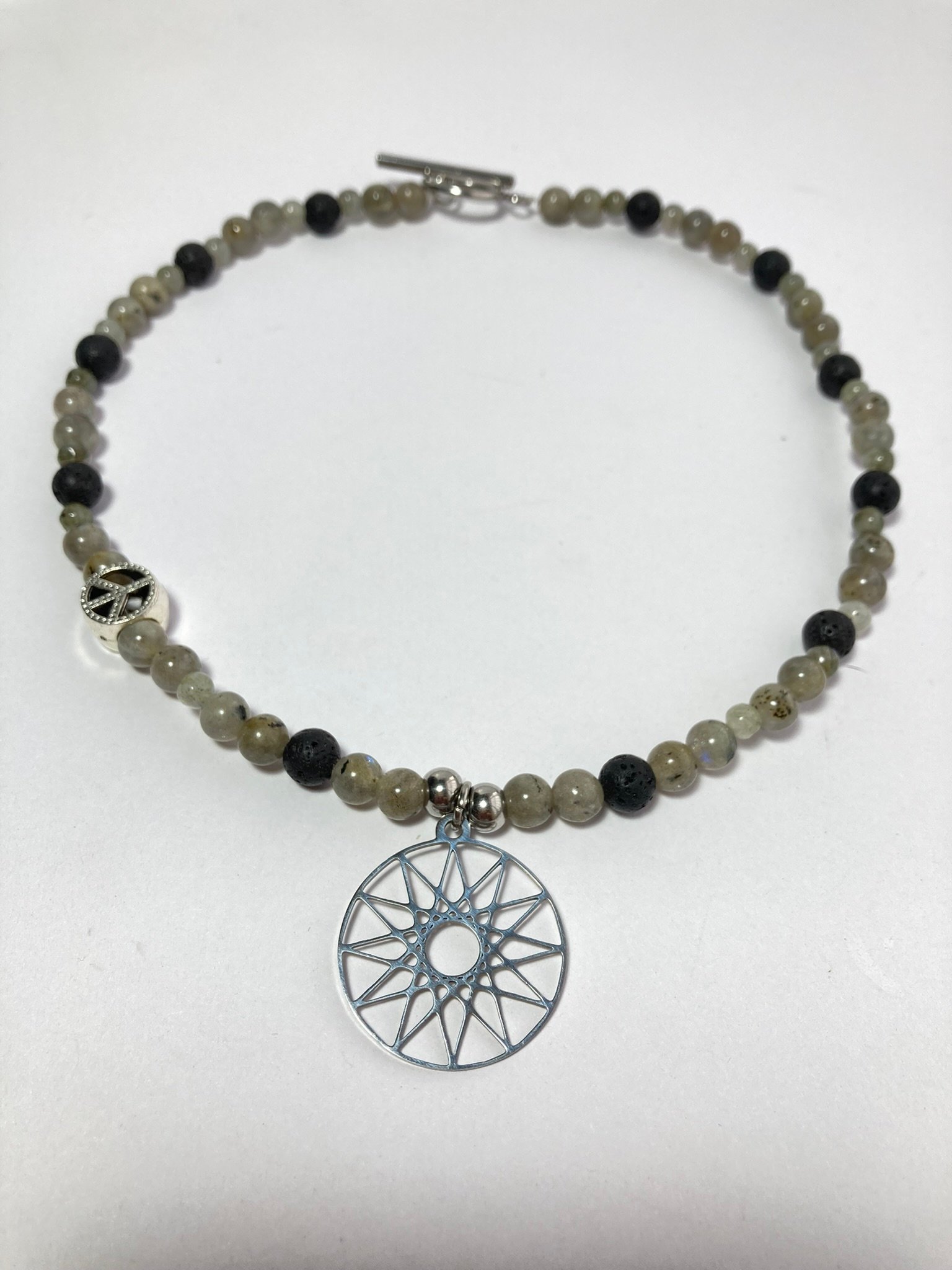 Choker elaborado con piedra natural labradorita, piedra volcanica y herrajes en acero inoxidable y plata antigua.