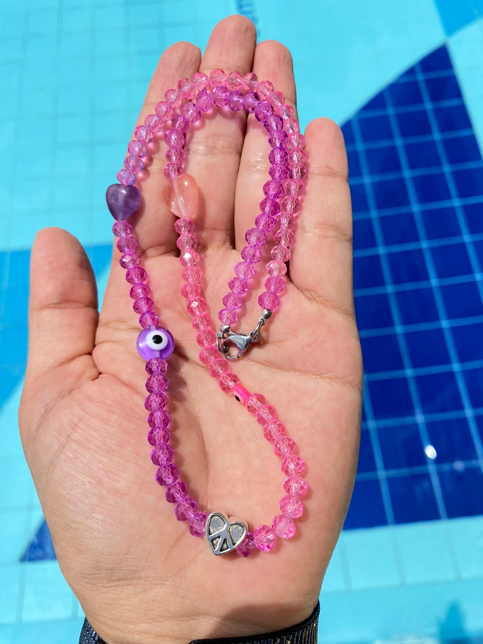 + EnvíoChoker elaborado con murano colorido, herrajes en acero, dije de corazón en plata antigua, ojo turco plastico y corazones en piedra natural.