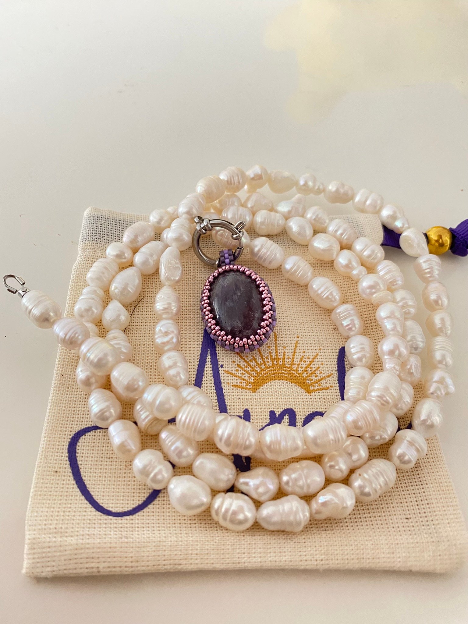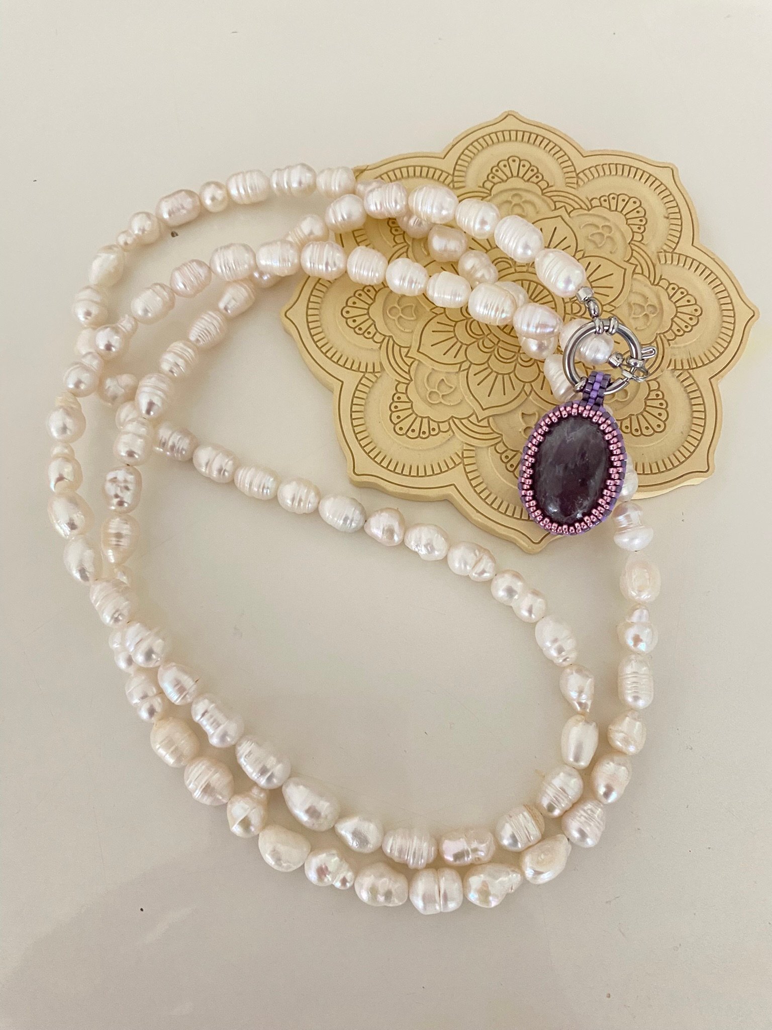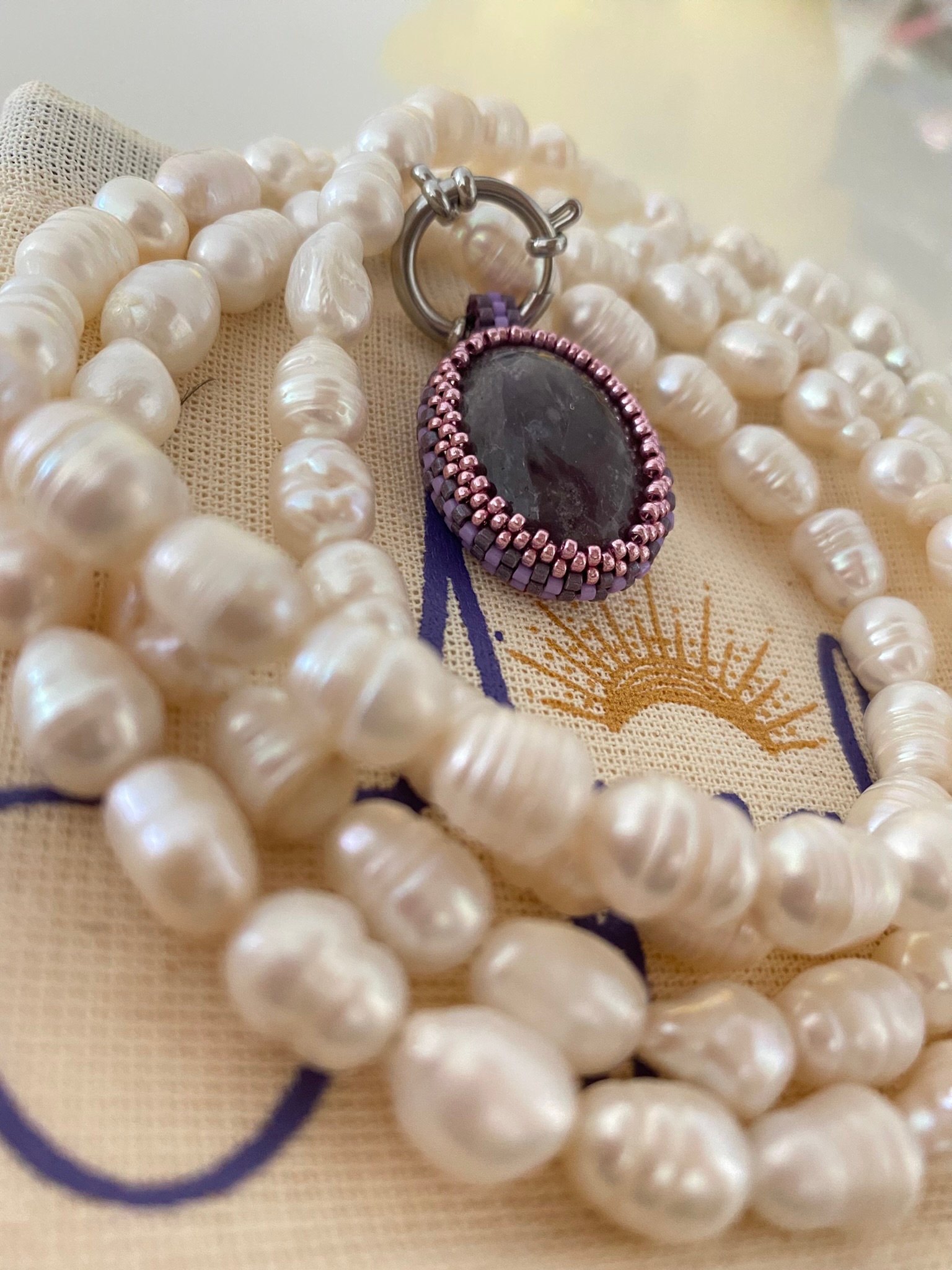 Collar elaborado con perlas de agua dulce 120 cm de largo, herrajes en acero y dije de piedra natural de alta calidad intercambiable y tejido en miyuki.