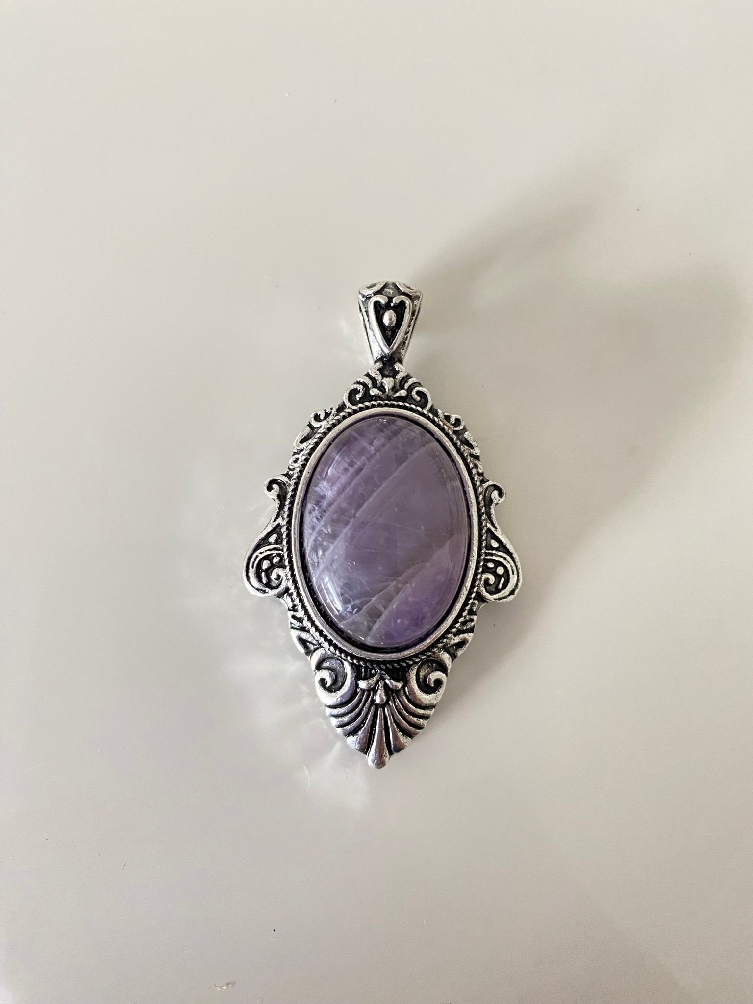 Dije elaborado con herrajes en plata antigua y piedra natural amatista.