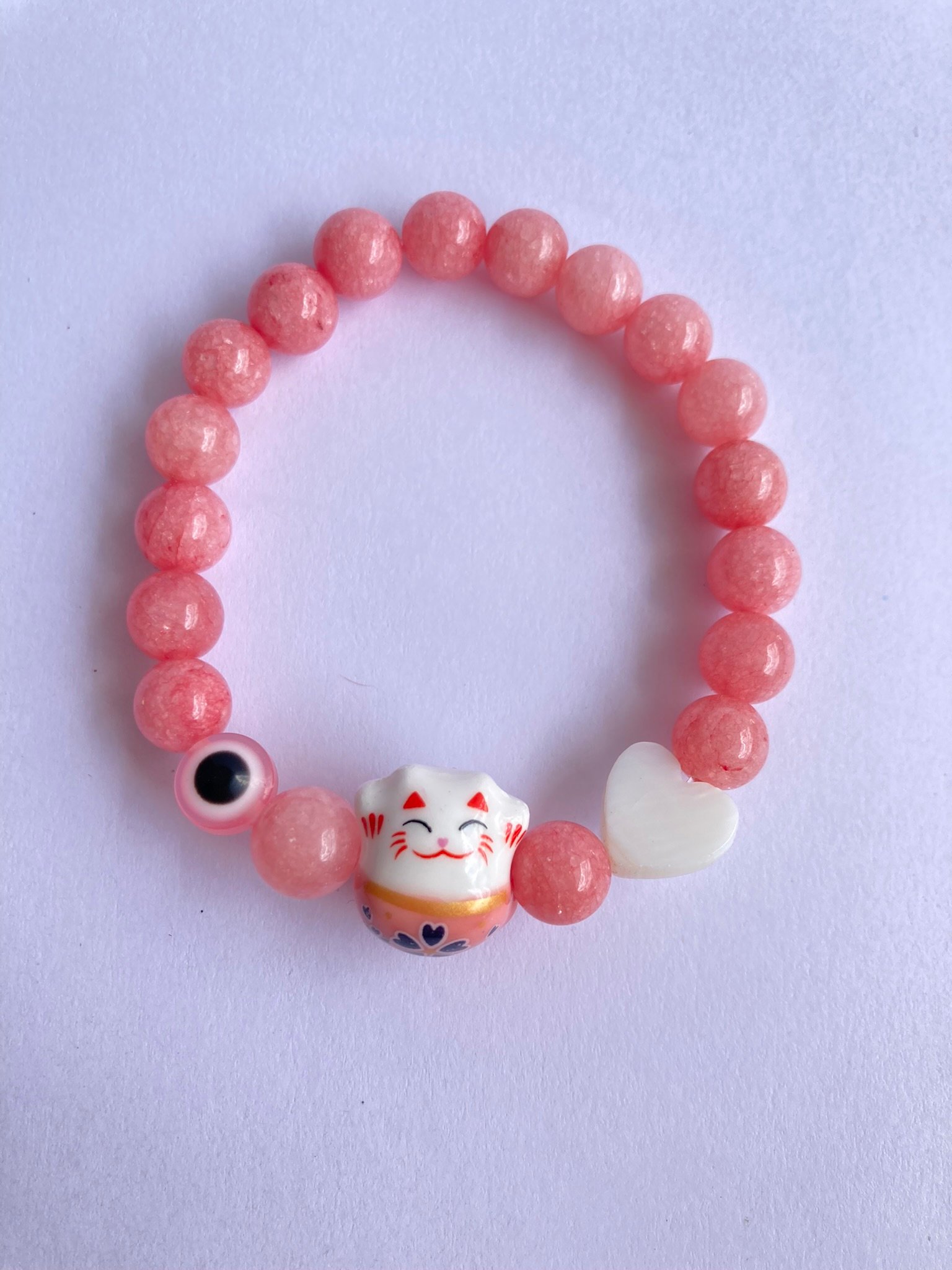 Manilla elaborada en elástico, piedra jade rosa, ojo turco plástico y corazón en nácar.