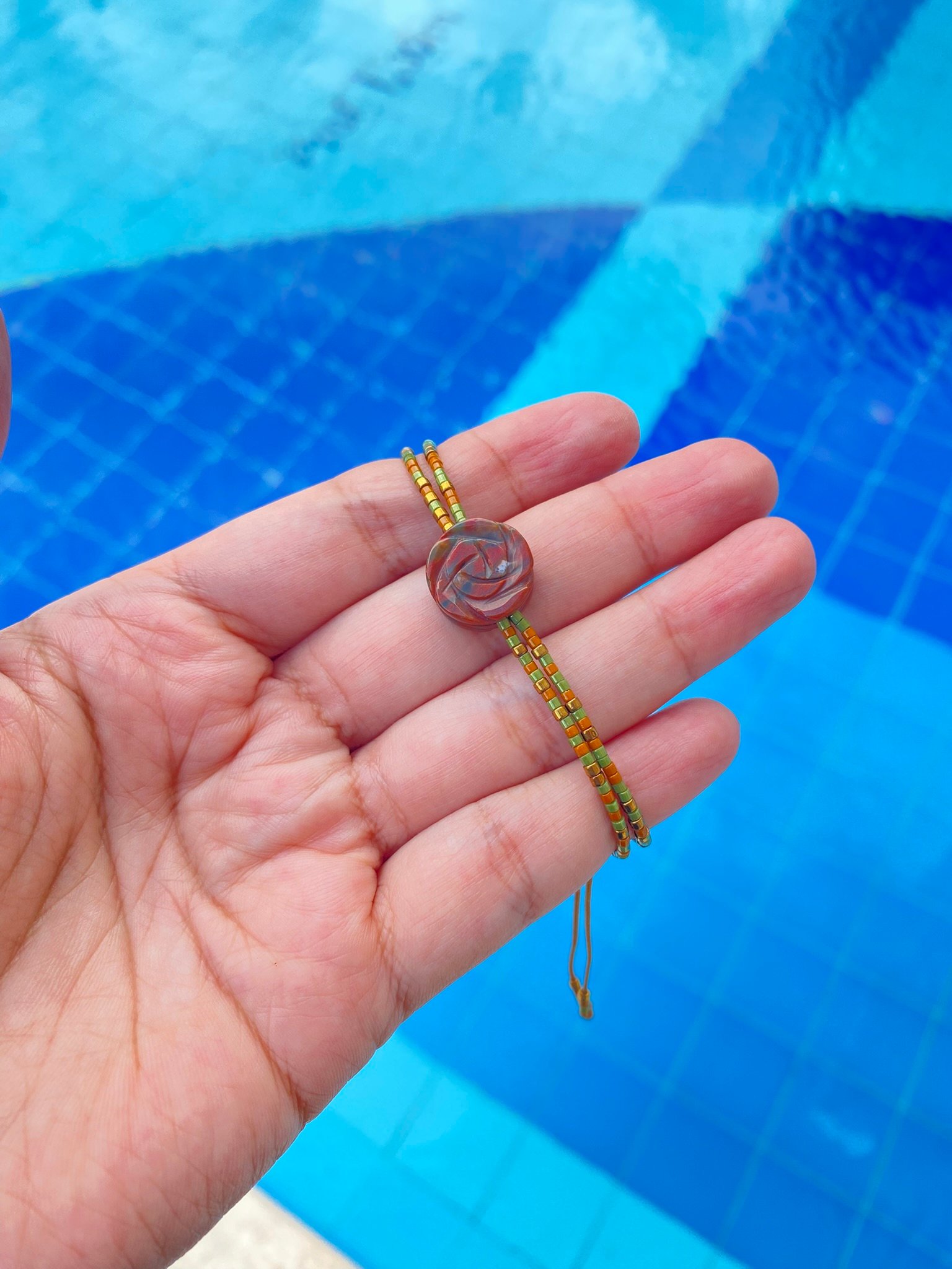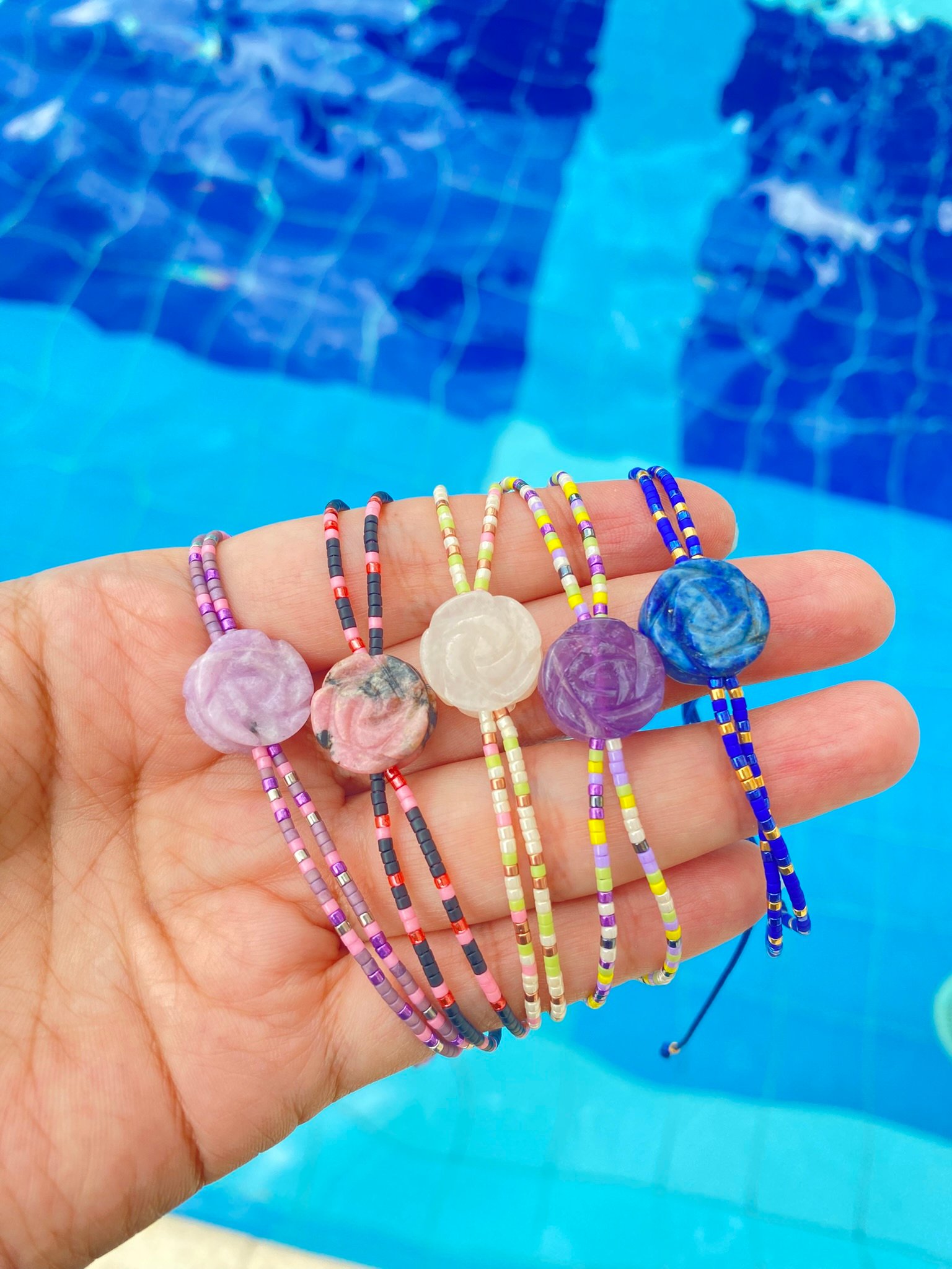 Descubre la delicadeza de nuestra manilla hecha a mano, diseñada con hilo celular, miyuki y con una exquisita piedra natural tallada en forma de rosa. Este complemento combina lo rústico con lo sofisticado, convirtiéndose en el accesorio ideal para cualquier ocasión.